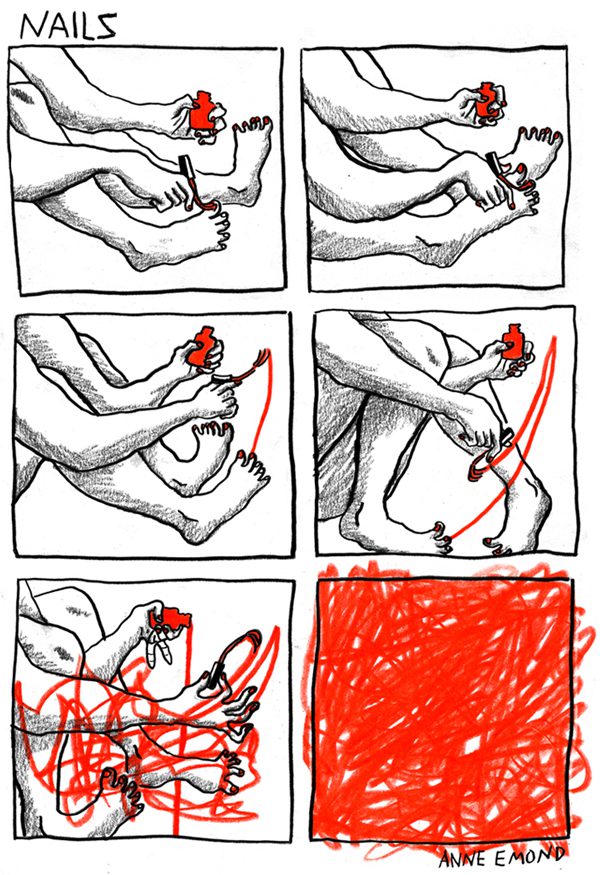 Really great, and SO FREAKIN TRUE. I love the jumble of legs and arms, the the frustrated crooked fingers – because that’s what it feels like to paint toes.