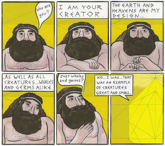 And this is only a fraction of a story that also includes intergalactic transgender assassins, a time travelling struggling artist, a skeezy hippie version of Noah, the proletariat struggles of giants, and Lucifer unwittingly forming the world during a sword battle with the Archangel Michael.
