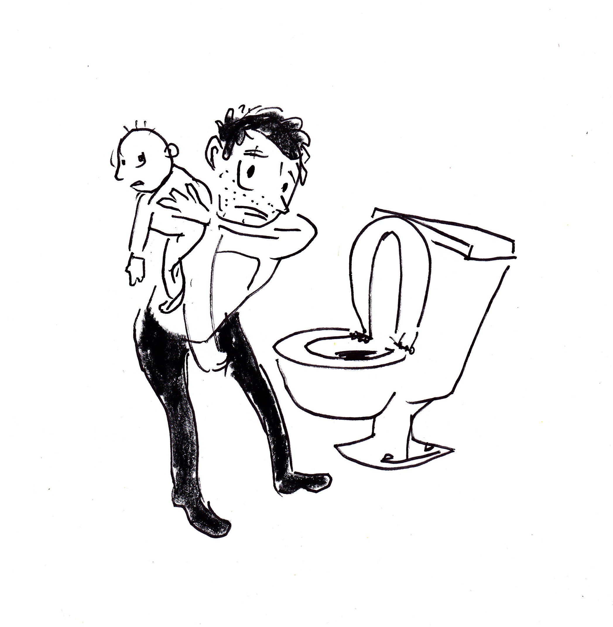 But hey! Time out from the Eternal Bleak! I have to get up and take a pee. And, I’m not going to lie, whenever I carry my four-month-old little sweetheart into what my mother used to call “the john,” I feel like I may be committing some kind of crime against propriety. Standing there, baby in one hand, johnson in the other, relieving myself, I wonder if suddenly copters will begin whirling overhead, klieg lights suddenly light up my house, and some branch of Law and Order SVU come sweeping in, so my heinous neighbors will see me led off in infamy by Ice T. That said, what’s a cashew-bladdered Dad supposed to do – leave his little munchkin lying on the carpet to be eaten by the family dog? Happily, I’ve talked to other Dads, and to a man, they all say the same thing: it’s not something you’d do with your four, fourteen, or twenty-four year old, but hey, a baby’s a baby. And yet – this is the fun part – to the man, as well, all dads make sure their baby’s head is facing the other direction. I mean, what are we, priests? How insane is that?