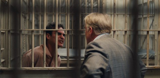 desires (sexual, alcoholic), the other miserable in his compulsive—and, he seems to understand, futile—pursuit of defeating those desires. When the police come to arrest Dodd for damage done to that cruise ship (borrowed, it turns out), and money defrauded from its owner, Quell gets violent, and they wind up in adjacent cells, and turn on each other. As Quell goes berserk—smashing the toilet, screaming, tearing at a bunk’s blankets with his teeth—Dodd stands with his hands on his hips and lectures him on his behavior. Dodd tells Quell he’s an animal, and Quell tells Dodd he’s a fake, and Dodd’s grandiloquence collapses into shouted obscenities. Anderson shoots them with a static camera, the cells divided evenly down the middle, the instinct and the intellect, the id and the ego, always at odds, but both suffering the same imprisonment.