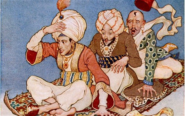 Warner: One of the metaphors of the book is the carpet. Not just the flying carpet, but the carpet as a woven surface in which many repetitions and motifs recur and mirror one another. This is very much reflected within the stories: they have borders within borders, repeated motifs which change. They have their feet in oral conventions, and for the mnemonics, the storyteller needs to have a structure in order to remember the stories. The tripartite structure—so you remember the third brother, second brother, first brother, or the first dervish, second dervish, and third dervish. This is very like embroidering a cloth, as you have to know where you are with the knots.