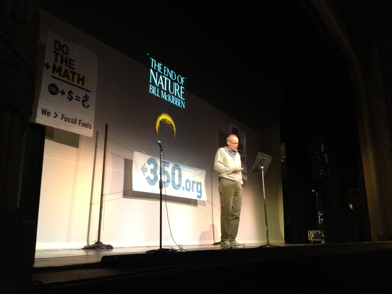 Since November 7th, McKibben and 350.org have been touring the country on his Do the Math Tour, inspired by his July Rolling Stone article, “Global Warming’s Terrifying New Math.” The focus of the article and the tour are three numbers: we’ve already raised the temperature of the planet by one degree Celsius by burning coal, oil, and gas since the beginning of the Industrial Revolution. Every country on Earth has agreed that to let the planet warm by two degrees would usher in climatological disaster. This means we can burn 565 more gigatons of fossil fuel by mid-century and still have a chance of staying under two degrees. However, fossil fuel companies and petro-states from Exxon to Saudi Arabia currently have proven reserves of 2,795 gigatons. In other words, they are already planning to burn five times the amount of carbon that scientists view as safe for civilization.