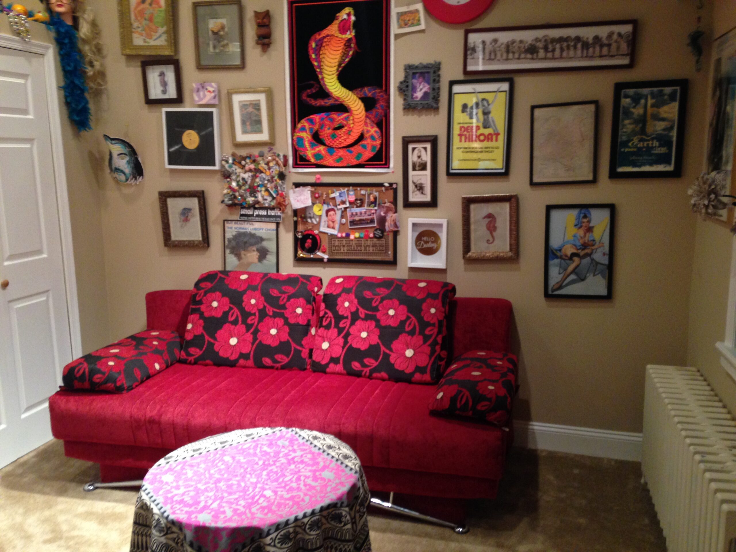 Otherwise, it would be kinda disingenuous to say that our studio aesthetic was a super planned thing. I mean, we wanted it to be vibrant, inviting, and not sterile—especially since it’s a relatively small space that we and our guests hang in for two or three hours when recording. But we also didn’t want to spend a ton of time (or any money, if we could help it) “curating” the vibe. I had just moved into a new place and had a bunch of extra furniture because my roommate moved in with furniture of his own. So that worked out nicely. We didn’t want to allocate Indiegogo campaign funds to decor/furniture unless it was necessary and we didn’t already own something or couldn’t find it for free (like, a lamp or chair or something.) So the decor is a hodgepodge of stuff we already owned, found objects, etc. There’s a “mixed media” collage in there that I made during an acid trip when I was twenty-two. A couple mannequin heads that my ex trash-picked. A neon blacklight poster of a cobra, proudly won during bingo at Tattooed Mom. That sorta thing. It all somehow fits together, I think?