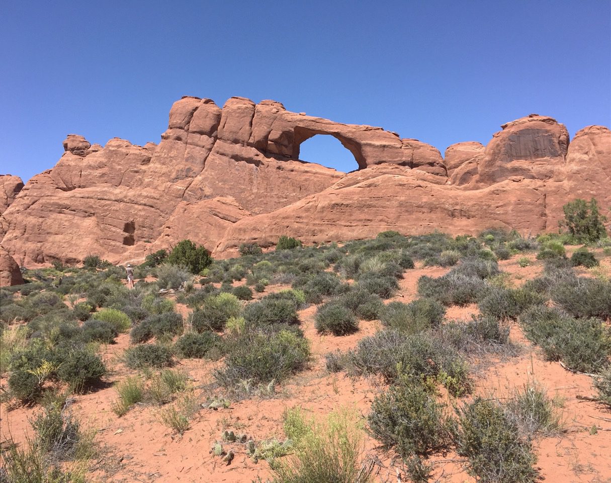 We heard the young couple before we saw them come bounding down the trail, hatless, pole-less and totally at ease. “Really worth the climb,” the man said. We were the only hikers they’d seen. I asked if we were close, and he nodded. “Breathtaking, and by far the biggest arch in the park.” We pressed on.
