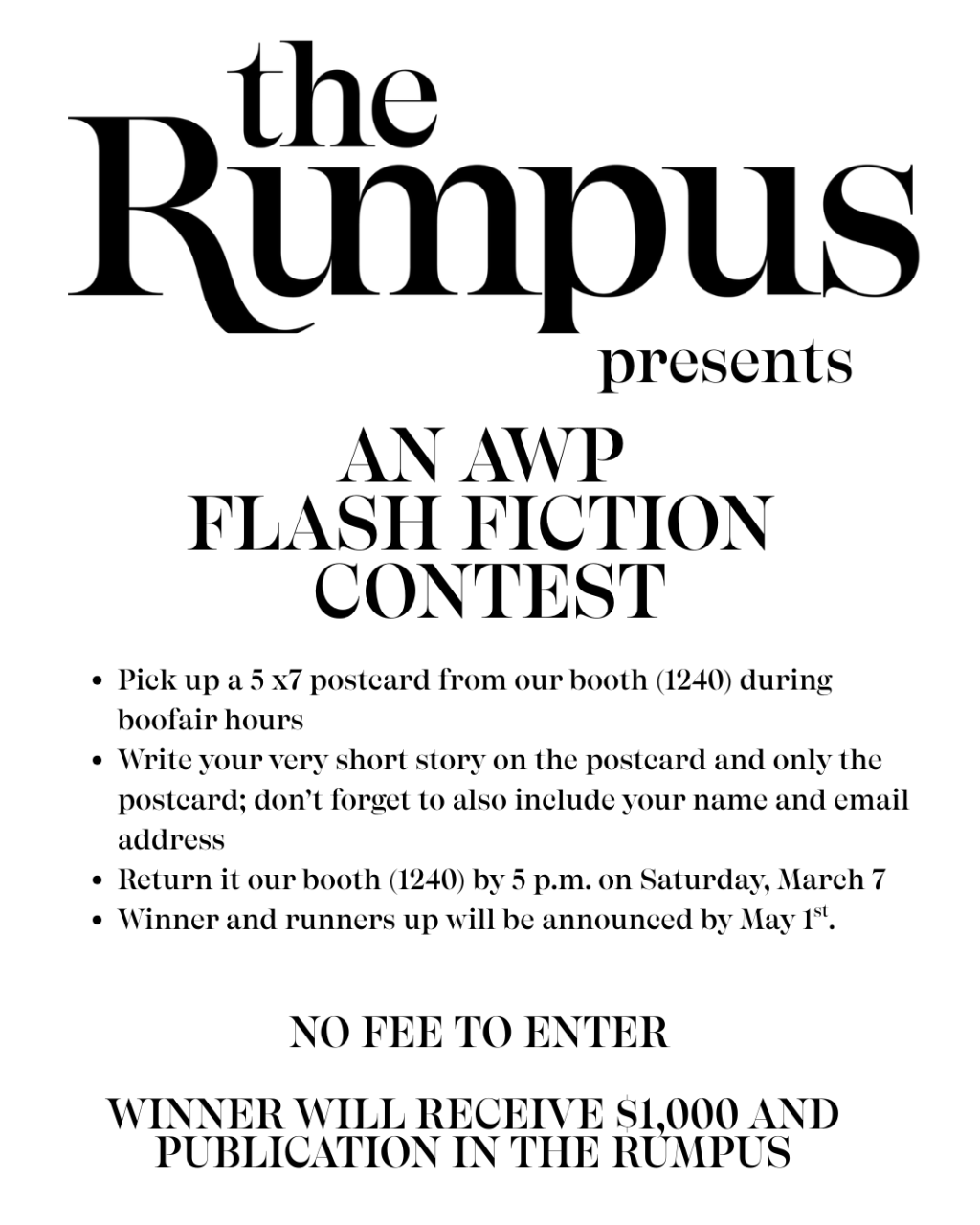 To spice things up, we’re having a fun flash fiction writing contest with a prize of $1,000 and publication in The Rumpus. Books from the Roxane Gay Books imprint will also be available for sale.